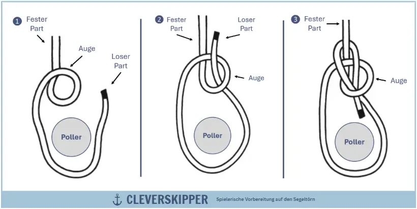 - Festmacher: Er dient dazu, eine feste Schlaufe (das „Auge“) zu bilden, die über einen Poller gelegt oder an Landpunkten befestigt wird.